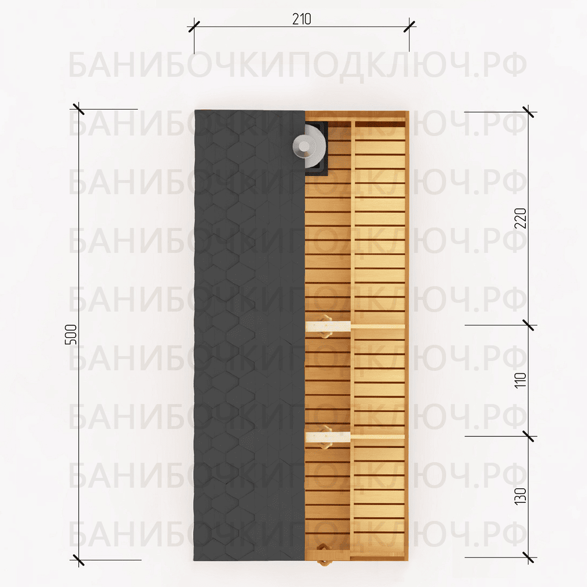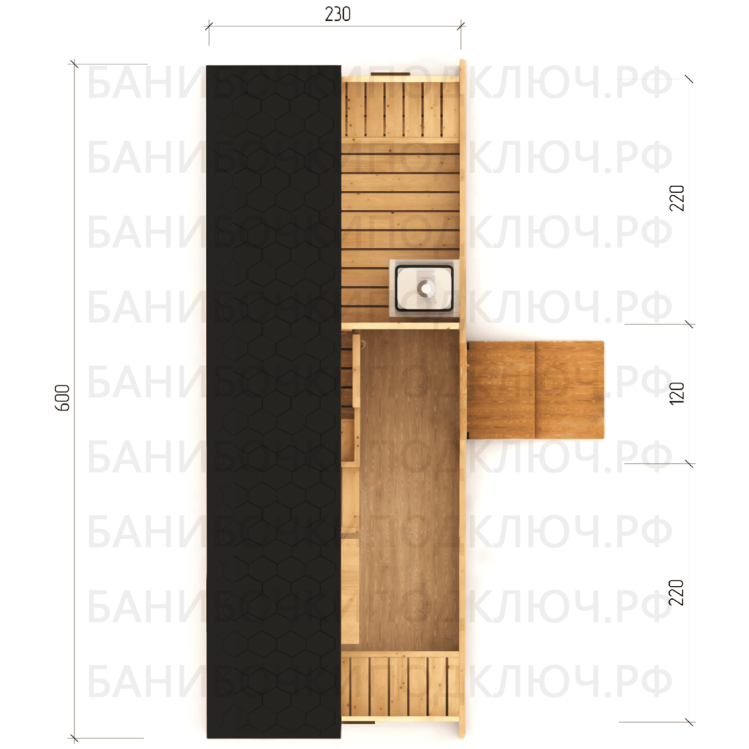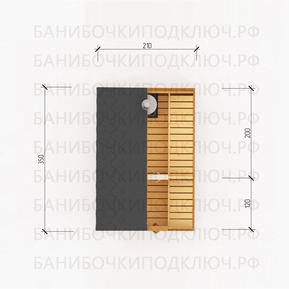 комната отдыха – 350х300, парная 220х300, мойка 120х150