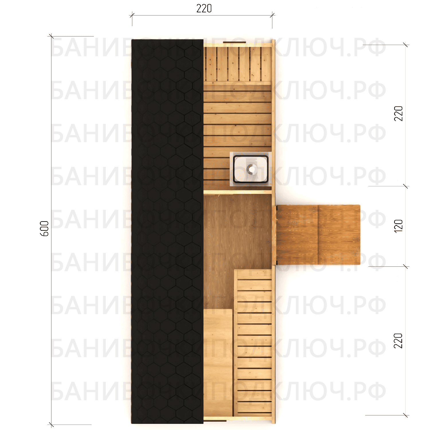 комната отдыха – 200х300, парная 180х220, мойка 120х220